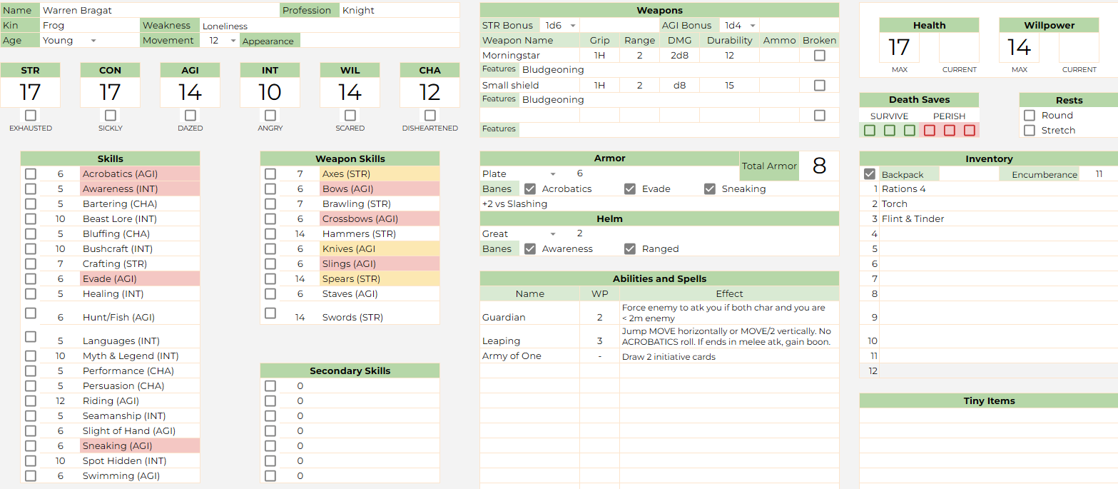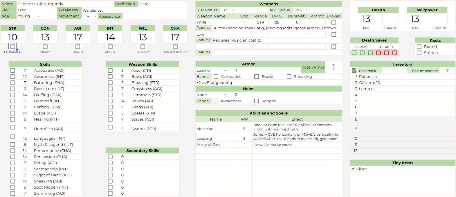 I’m playing with two characters: Gil Burgundy, a bard, and Warren Bragat, a knight. Both are Frog People, a new playable kin introduced in the Bestiary book. Here are their sheets: